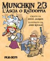 Munchkin 2/3 L'Ascia o Raddoppia è un'espansione per Munchkin, vincitore dell’Origins award nel 2001 come miglior gioco di carte tradizionale, che presenta tutta l’essenza delle prime partite di D&D senza tutta quella parte noiosa sull’interpretazione... Personaggi che cambiano classe o razza in base alla situazione, le armi e i mostri più improbabili che si possano immaginare rendono questo titolo uno dei migliori giochi demenziali sull’ambiente dei giochi di ruolo, anche grazie alle sempre esilaranti illustrazioni di John Kovalic. La traduzione italiana mantiene tutto il sapore della versione originale con tonnellate di giochi di parole uniti a definizioni create appositamente per il nostro ambiente!