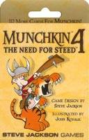 Munchkin 4: The Need for Steed è l'ultima espansione per il Munchkin originale! 112 carte sempre illustrate da John Kovalic ricche di mostri da eliminare, tesori da arraffare, e nuovi mezzi per colpire alle spalle i vostri amici! Questa nuova espansione introduce i Destrieri, le fidate cavalcature della leggenda... oh, un attimo, ma questo è Munchkin! Quindi, a dire la verità qui troverete non solo Dragoni e Tigri, ma anche Criceti Giganti Mutanti, il Pollastro, e Banana Joe, che potrebbe essere una cavalcatura, ma anche un Seguace... difficile a dirsi.
